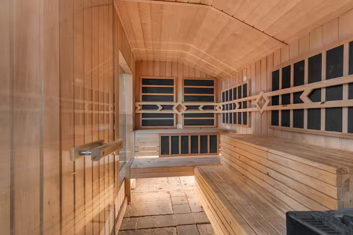 Saunan er bæði með heitan ofn - og infra-rauða panela sem gefa einstaka upplifun. Það eru þrjár lotur - og hægt er að fara í kaldan pott inn á milli.